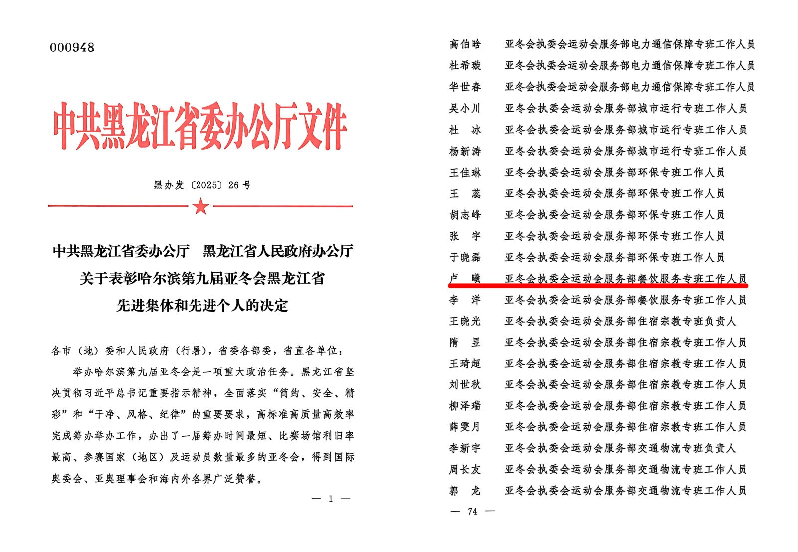 喜报:我校两名同志荣获亚冬会表彰