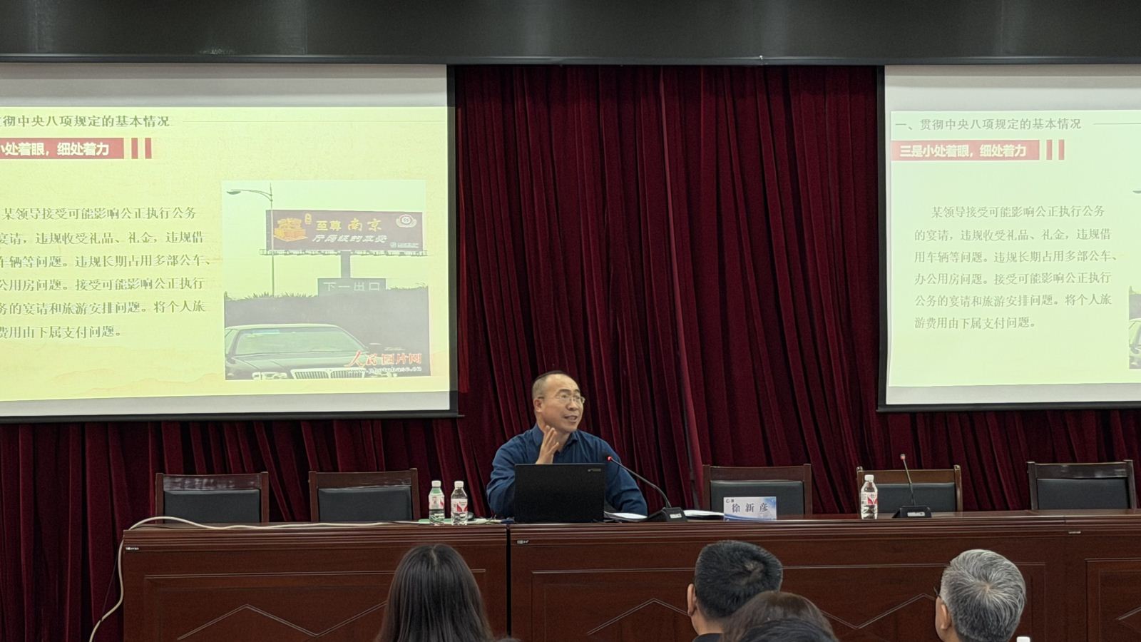徐新彦副教授系统阐释了中央八项规定精神的核心要义,深入剖析了新形势下加强作风建设的重大意义与紧迫性,并围绕“常抓不懈、涵养优良作风”主题,提供了清晰的实践指引。报告内容详实、逻辑严密,兼具理论高度与实践指导性,对学校提升治理效能具有积极推动作用。