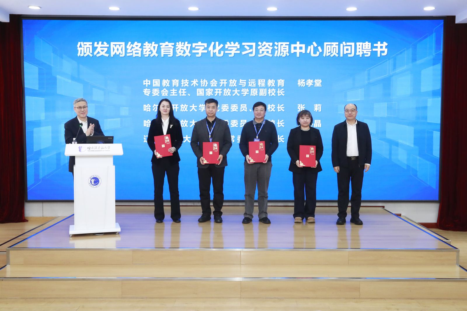 中国教育技术协会开放与远程教育专业委员会主任、国家开放大学原副校长杨孝堂,以《教育教学与资源建设》为题,厘清了远程教育教学设计系统框架,深入剖析了资源建设的分类、开发原则等关键要素;国家开放大学学习资源部副部长董立超围绕《学习资源高质量发展的思路与重点》,提出“数智赋能、供需匹配、共建共享”核心发展思路,明确六大资源高质量建设方向;国家开放大学数字化学习资源中心主任张暾发布《网络教育数字化学习资源中心2025年工作报告》,总结全年工作成果,指出全国已建成264家分中心,资源共建共享生态圈逐步完善,同时提出未来发展举措;中心崔沁则以《数智赋能:基于岗位胜任力的学习资源建设》为题,围绕人才培养模式改革、资源建设构想等内容展开论述。哈尔滨、重庆、陕西三所开放大学作为优秀分中心代表,分享了各具特色的实践经验。51所办学单位分别荣获数字化服务卓越单位 、团队协作示范单位、资源共享模范单位等称号。哈尔滨开放大学被评为数字化服务卓越单位。